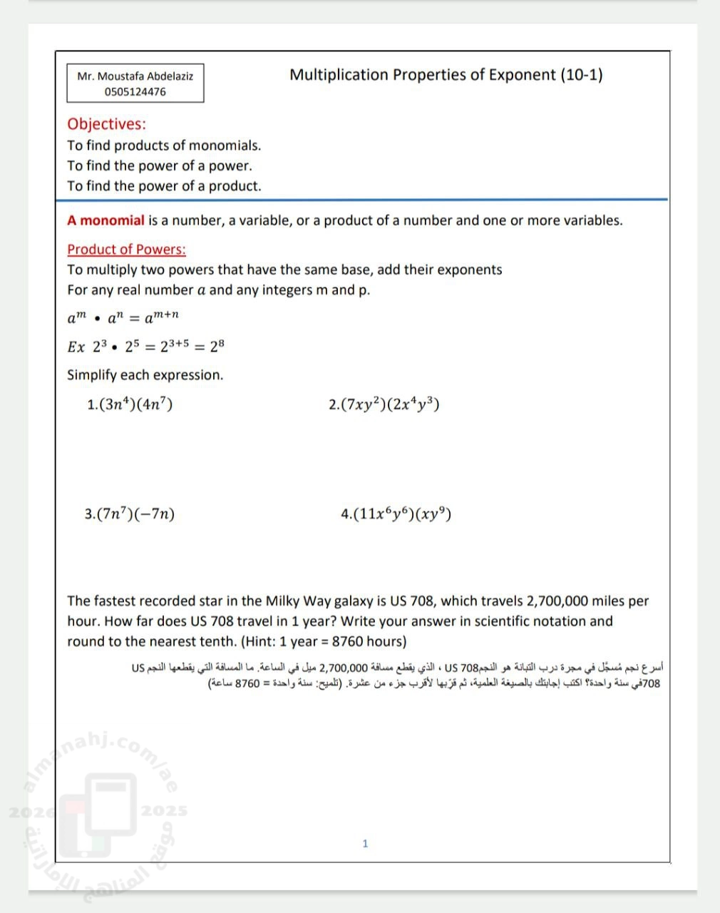 معلومات الملف: ملزمة الوحدة العاشرة القوى و الجذور مع الشرح و تدريبات منهج ريفيل Unit: 10 Exponents and Roots 1. Multiplication Properties of Exponent 2. Division Properties of Exponents 3. Negative Exponents 4. Rational Exponents 5. Simplifying Radical Expressions 6. Operations With Radical Expression 7. Exponential Equations | ||