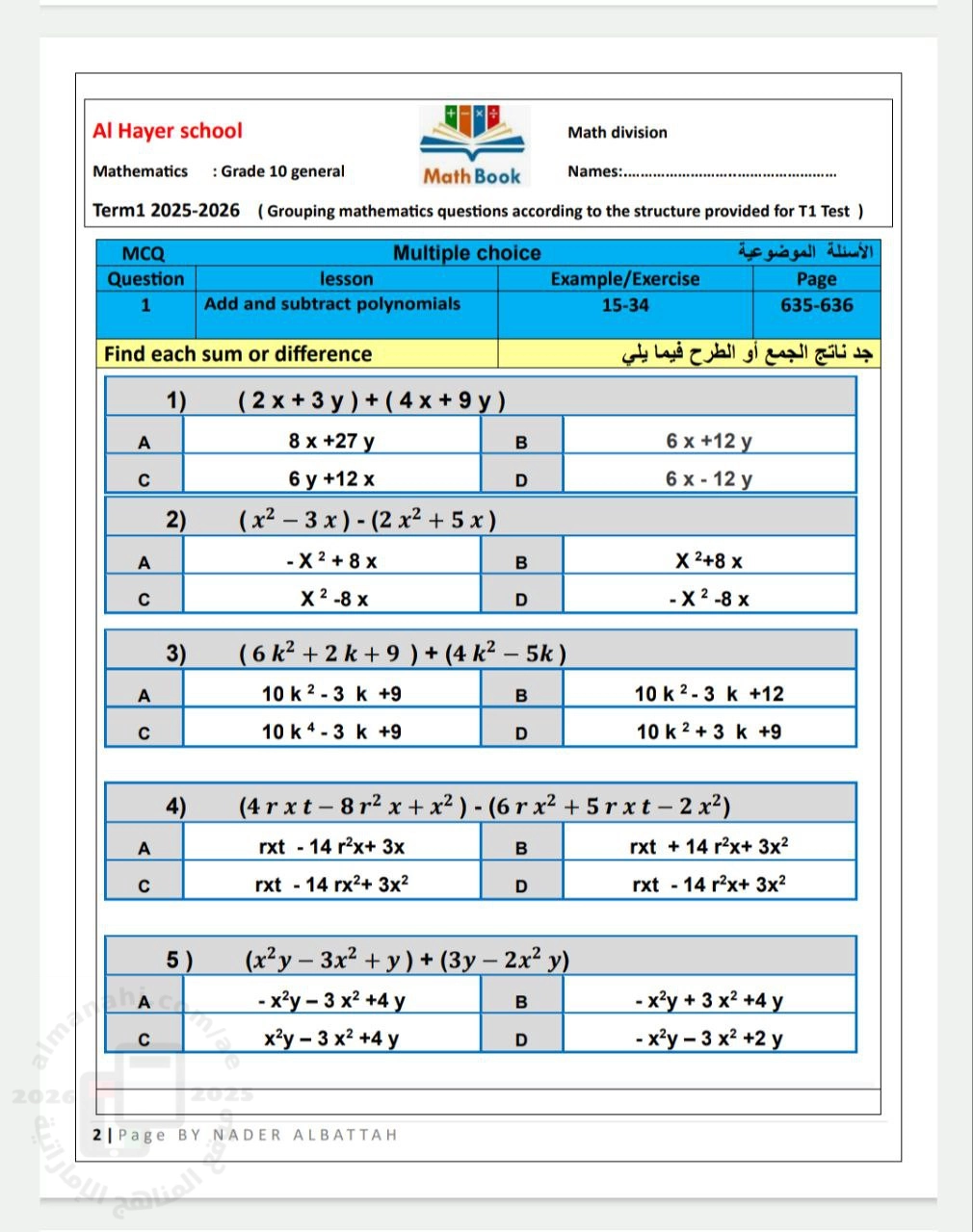 10. الصف التاسع المتقدم, رياضيات, تجميعة أسئلة وفق الهيكل الوزاري الجديد منهج ريفيل