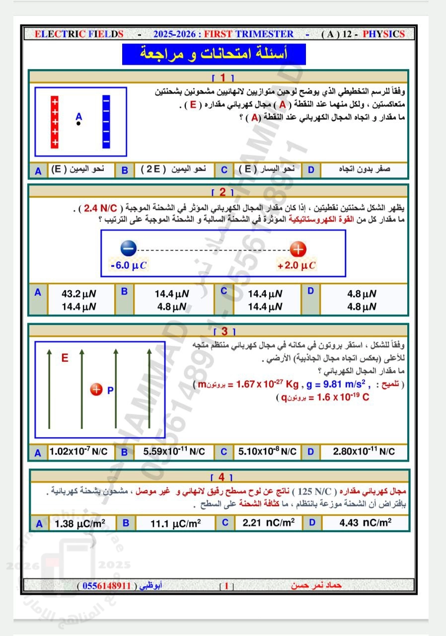 | أوراق عمل مراجعة الوحدة الثانية المجال الكهربائي وقانون جاوس - إعداد: حماد نمر حسن | ||