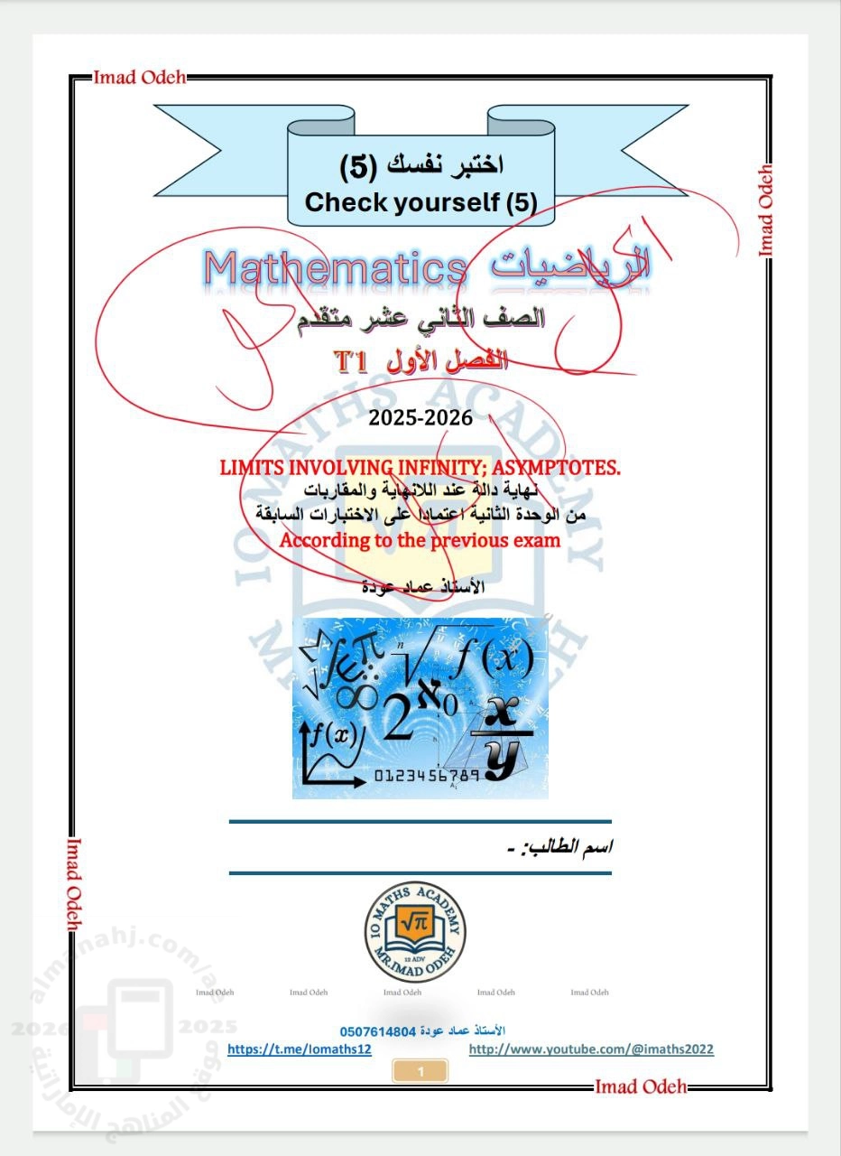 | حل مراجعة الدرس الخامس Limits involving infinity, asymptotes نهاية دالة عند اللانهاية والمقاربات من الوحدة الثانية (اختبر نفسك 5) - إعداد: عماد عودة | ||