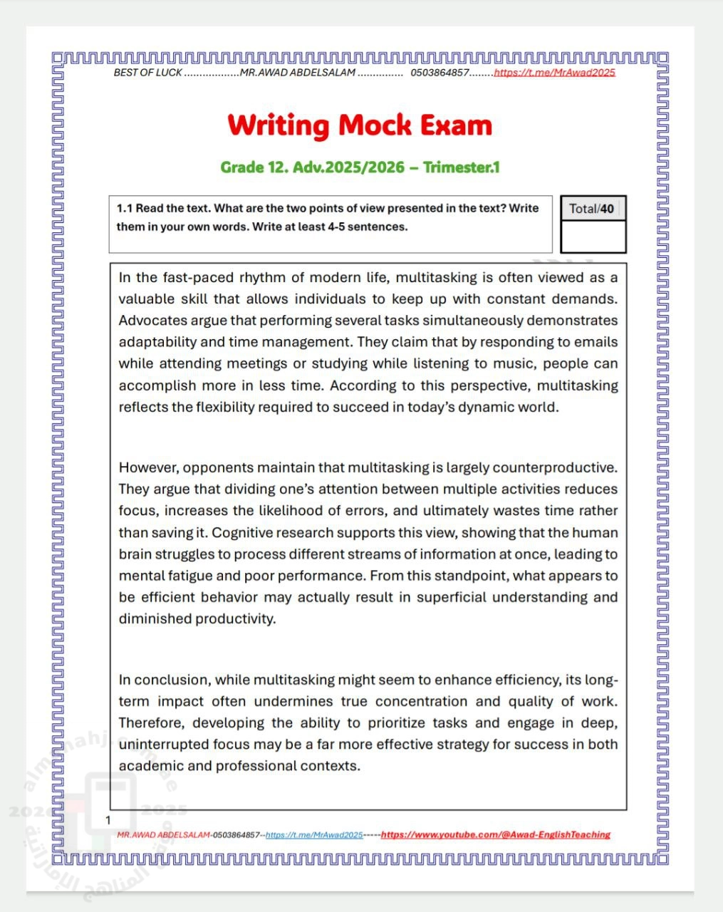 | أسئلة اختبار تدريبي Writing Mock Exam المسار المتقدم - إعداد: AWAD ABDELSALAM | ||