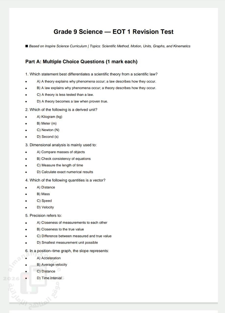 8. الصف التاسع العام, علوم, اختبار مراجعة وفق الهيكل الوزاري الجديد منهج انسباير متبوع بالإجابات