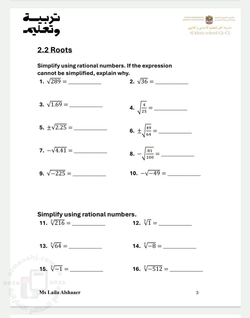 10. أوراق عمل واختبارات الوحدة الأولى الأعداد الحقيقية