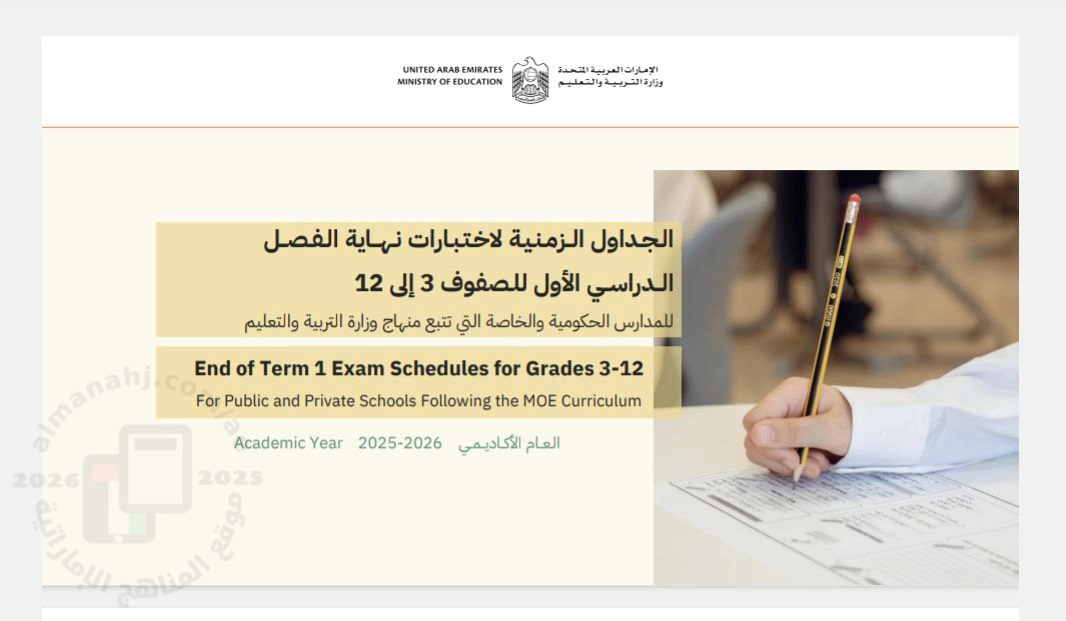 | الجداول الزمنية لاختبارات نهاية الفصل الأول للصفوف من 3 إلى 12 للعام 2025-2026 | ||