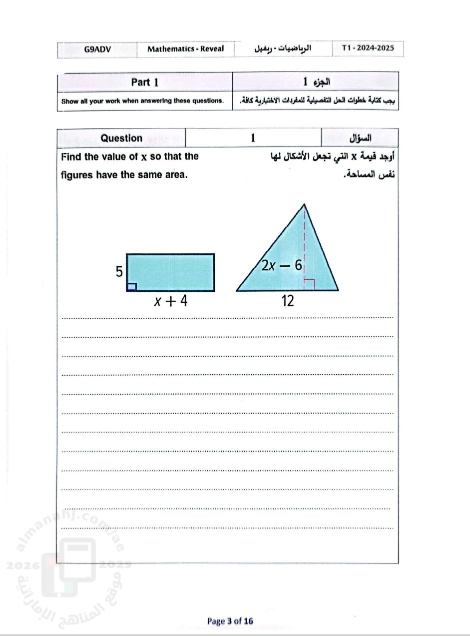 أسئلة الامتحان النهائي منهج ريفيل القسم الورقي, الصف التاسع المتقدم, رياضيات, الفصل الأول, 2024-2025, منهج انجليزي - المناهج الإماراتية