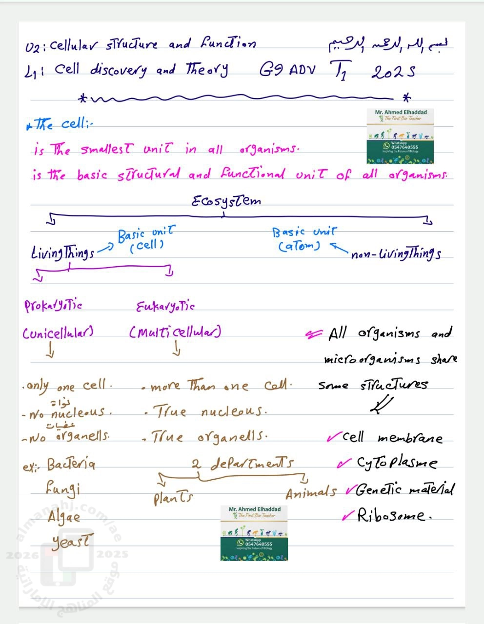 7. الصف التاسع المتقدم, علوم, ملخص وشرح الدرس الأول Cell discovery and theory من الوحدة الثانية منهج انسباير