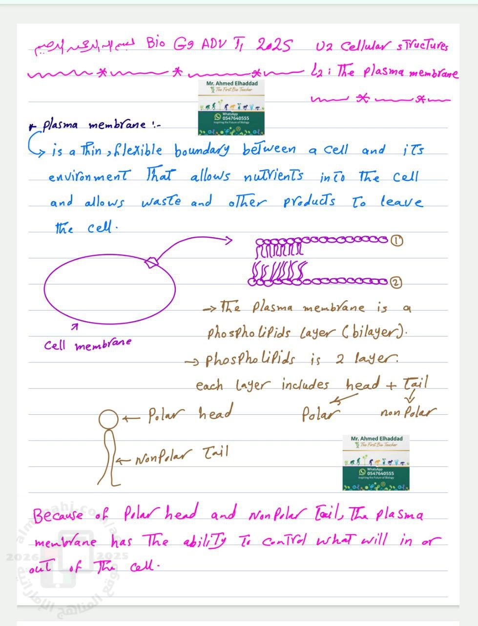 6. الصف التاسع المتقدم, علوم, ملخص وشرح الدرس الثاني The plasma membrane من الوحدة الثانية منهج انسباير
