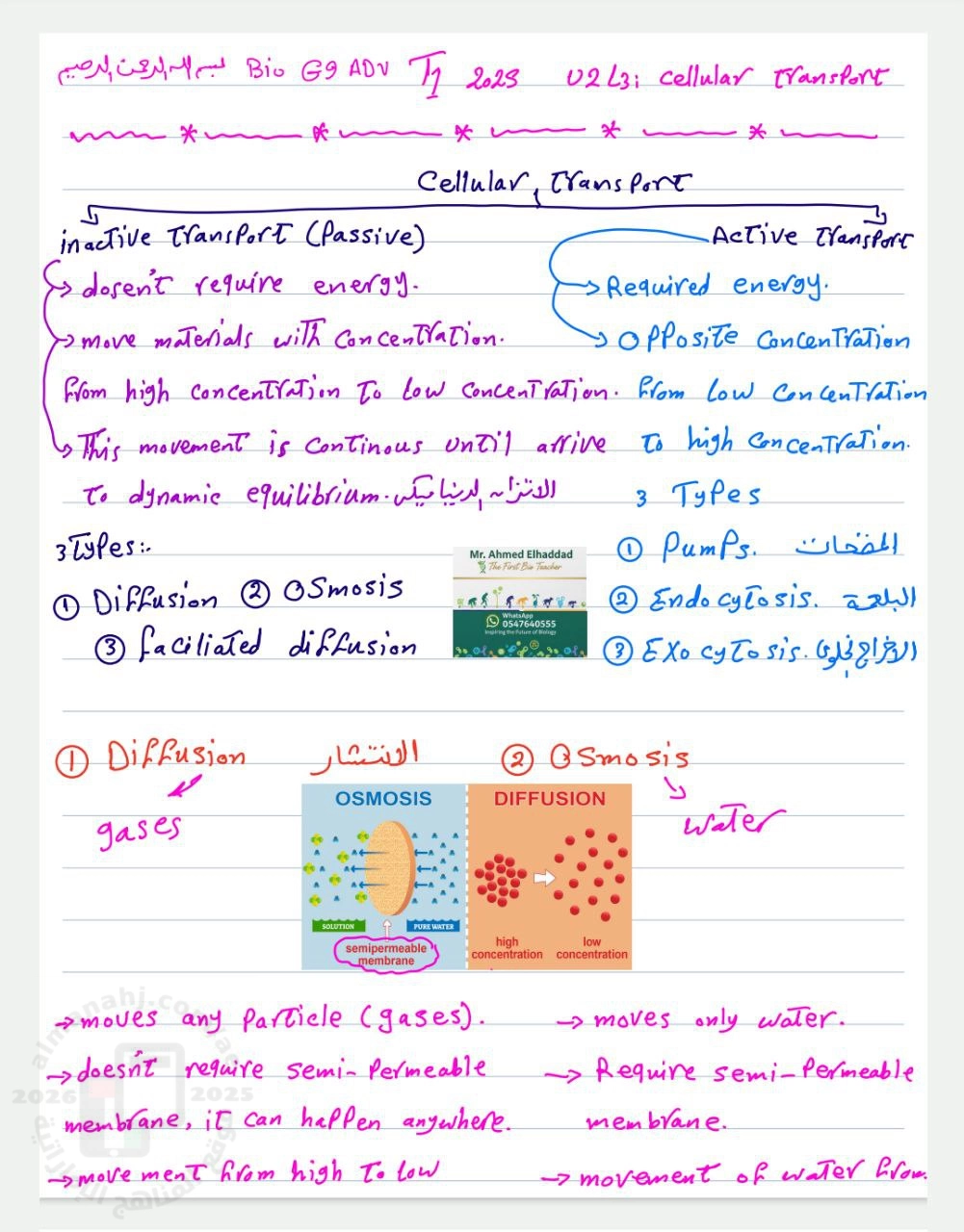 معلومات الملف: ملخص و شرح الدرس الثالث Cellular transport من الوحدة الثانية Cellular structure and function منهج انسباير بخط اليد للصف التاسع المتقدم