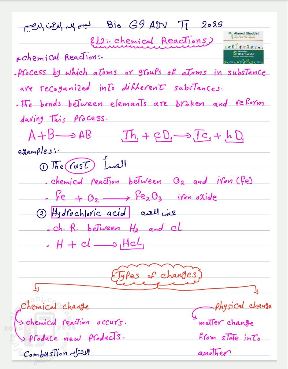 معلومات الملف: ملخص و شرح الدرس الثاني Chemical reactions التفاعلات الكيميائية من الوحدة الأولى منهج انسباير بخط اليد للصف التاسع المتقدم الفصل الأول