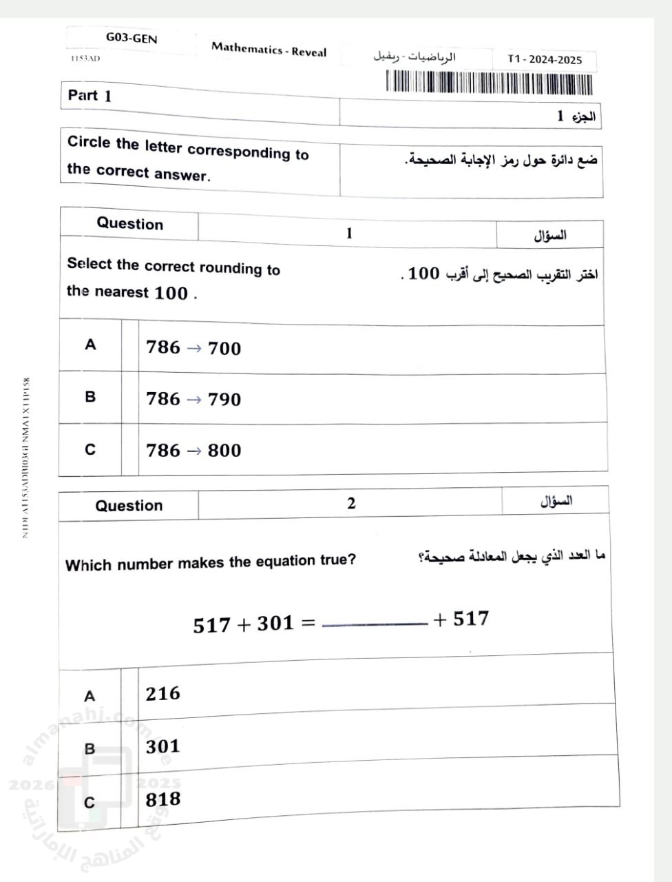 | 5. الصف الثالث, رياضيات, أسئلة اختبار تجريبي Reveal mock test منهج ريفيل قبل 2 ساعات | المشاهدات: 67
