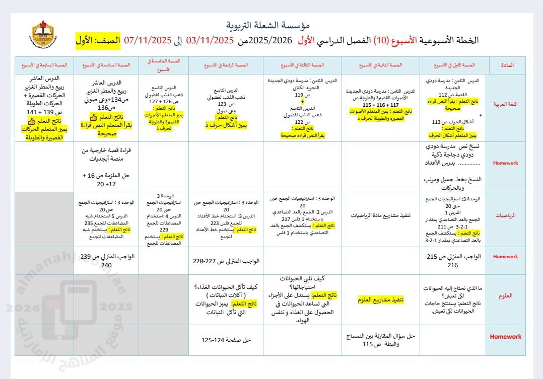 | الخطة الأسبوعية الأسبوع العاشر لجميع الصفوف من مؤسسة الشعلة التربوية - إعداد: مدرسة الشعلة الخاصة | ||