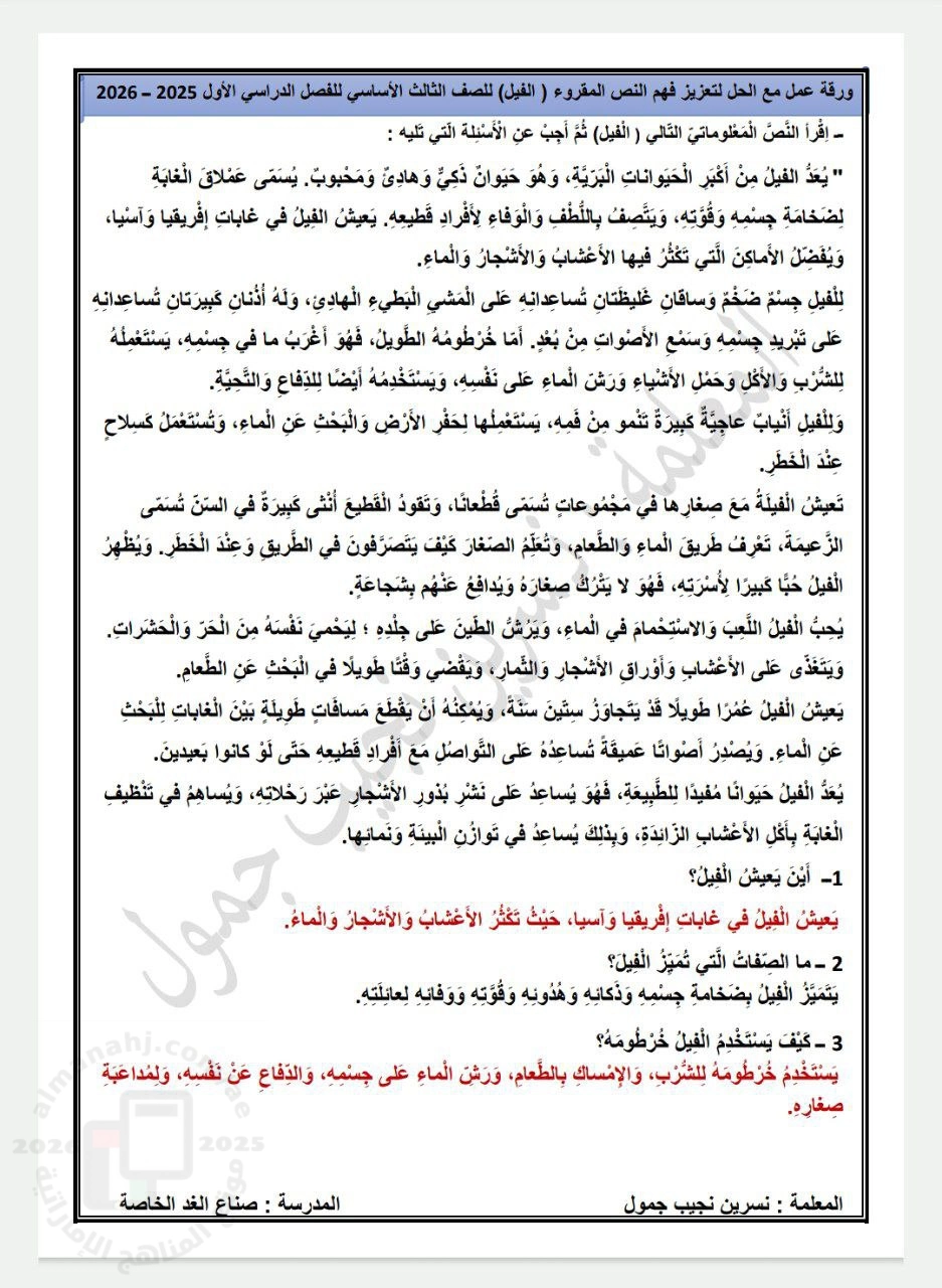 | نموذج إجابة ورقة عمل لتعزيز فهم النص المقروء النص المعلوماتي - إعداد: نسرين نجيب جمول | ||