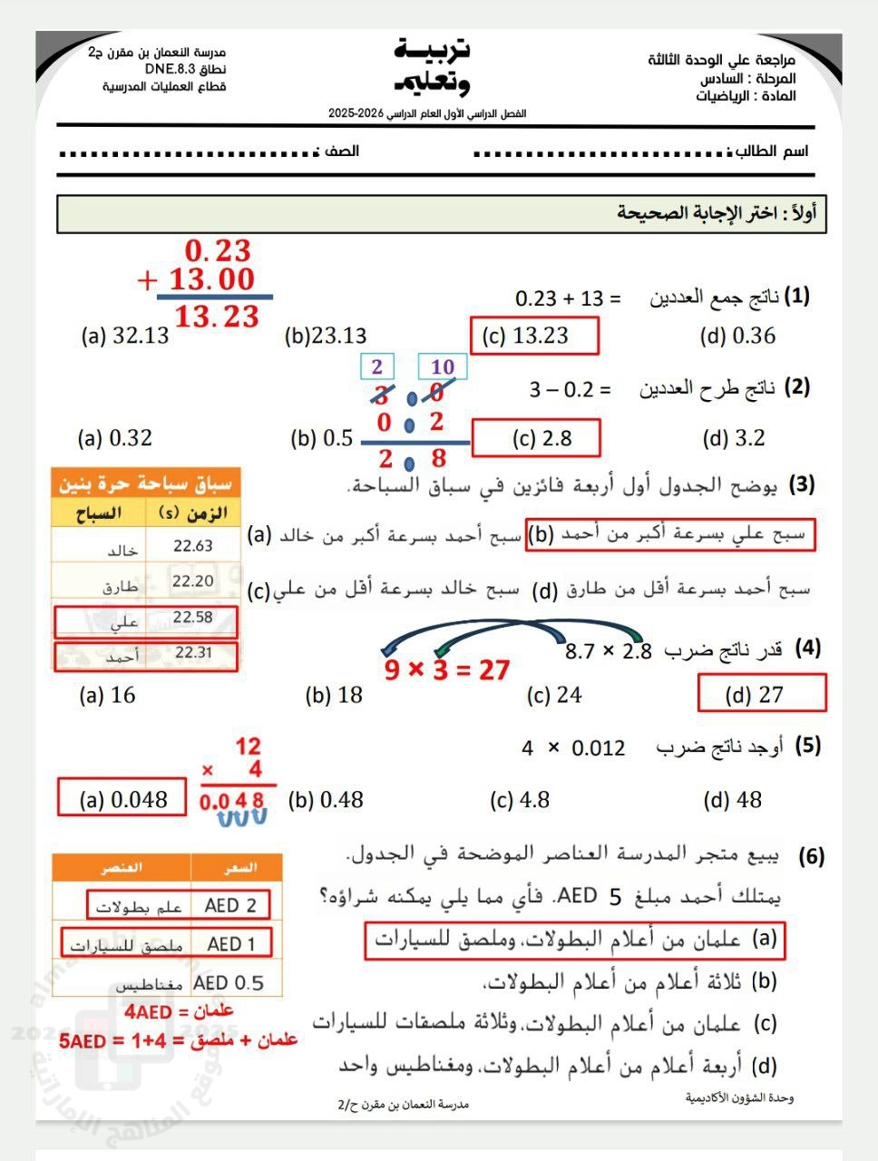 معلومات الملف: مراجعة الوحدة الثالثة إجراء عمليات حسابية على الأعداد متعددة الأرقام مع الحل | ||