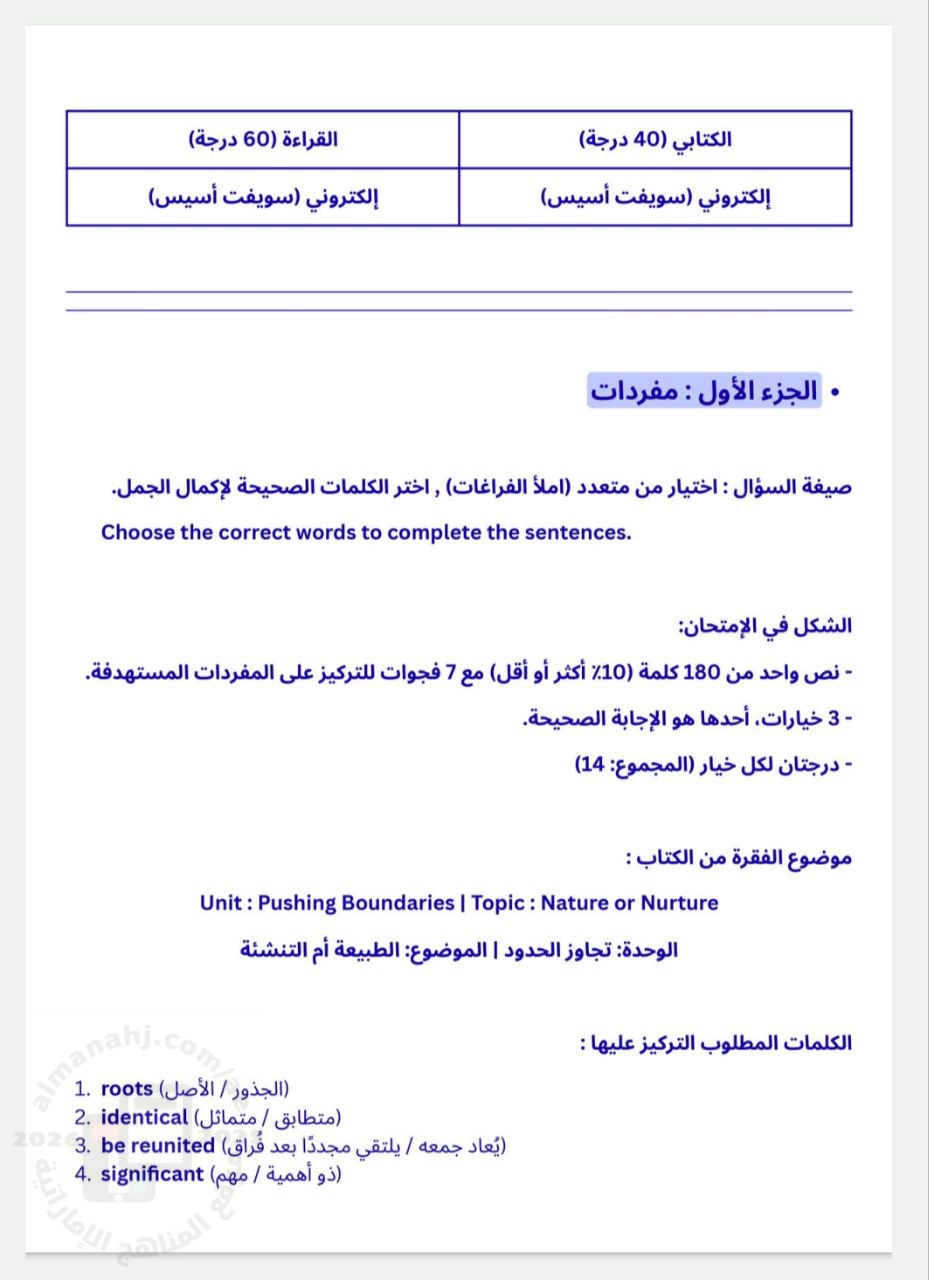 | اضغط هنا لتحميل وعرض ( شرح هيكلية الاختبار النهائي المسار المتقدم والنخبة مع تدريبات متبوعة بالإجابات ) | |||