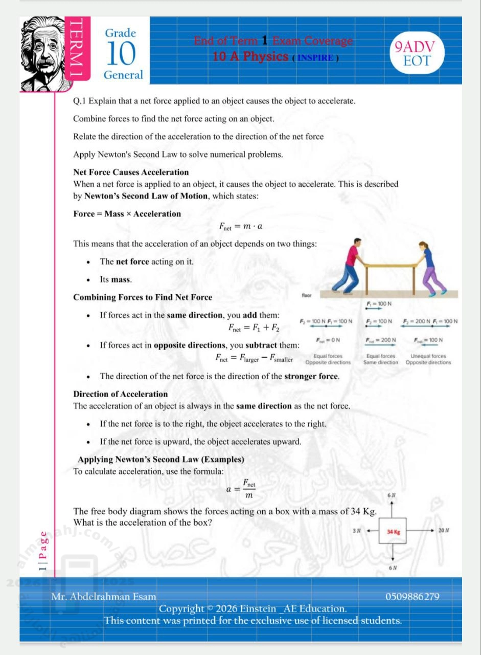 2. ملخص وتدريبات الدرس الأول Force and motion منهج انسباير