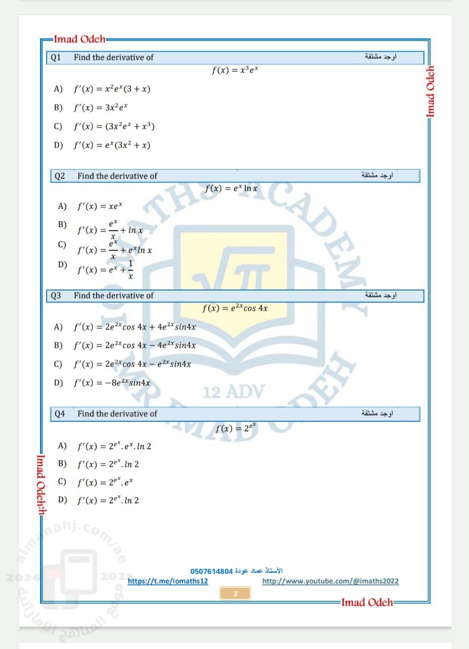معلومات الملف: مراجعة الدرس السابع Derivatives of Exponential and Logarithmic Functions مشتقة الدوال الأسية والدوال اللوغاريتمية من الوحدة الثالثة وفق اختبارات وزارية سابقة و بدون الحل ( احتبر نفسك 11 )