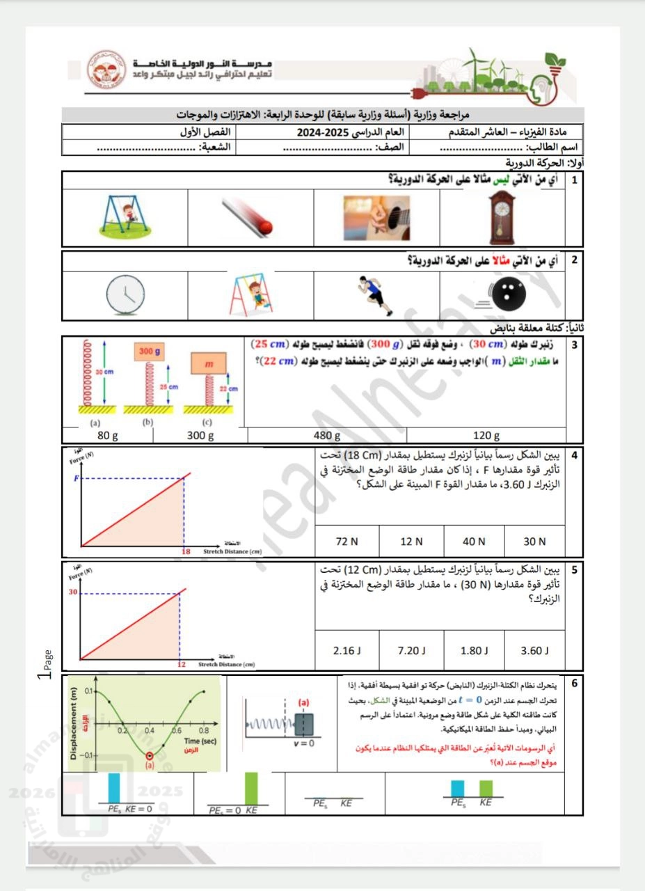 | السابق: ورقة عمل الوحدة الأولى الاهتزازات والموجات | الملف الحالي: 36583 | أنت تتصفح الملف الأخير في الصف العاشر المتقدم |
