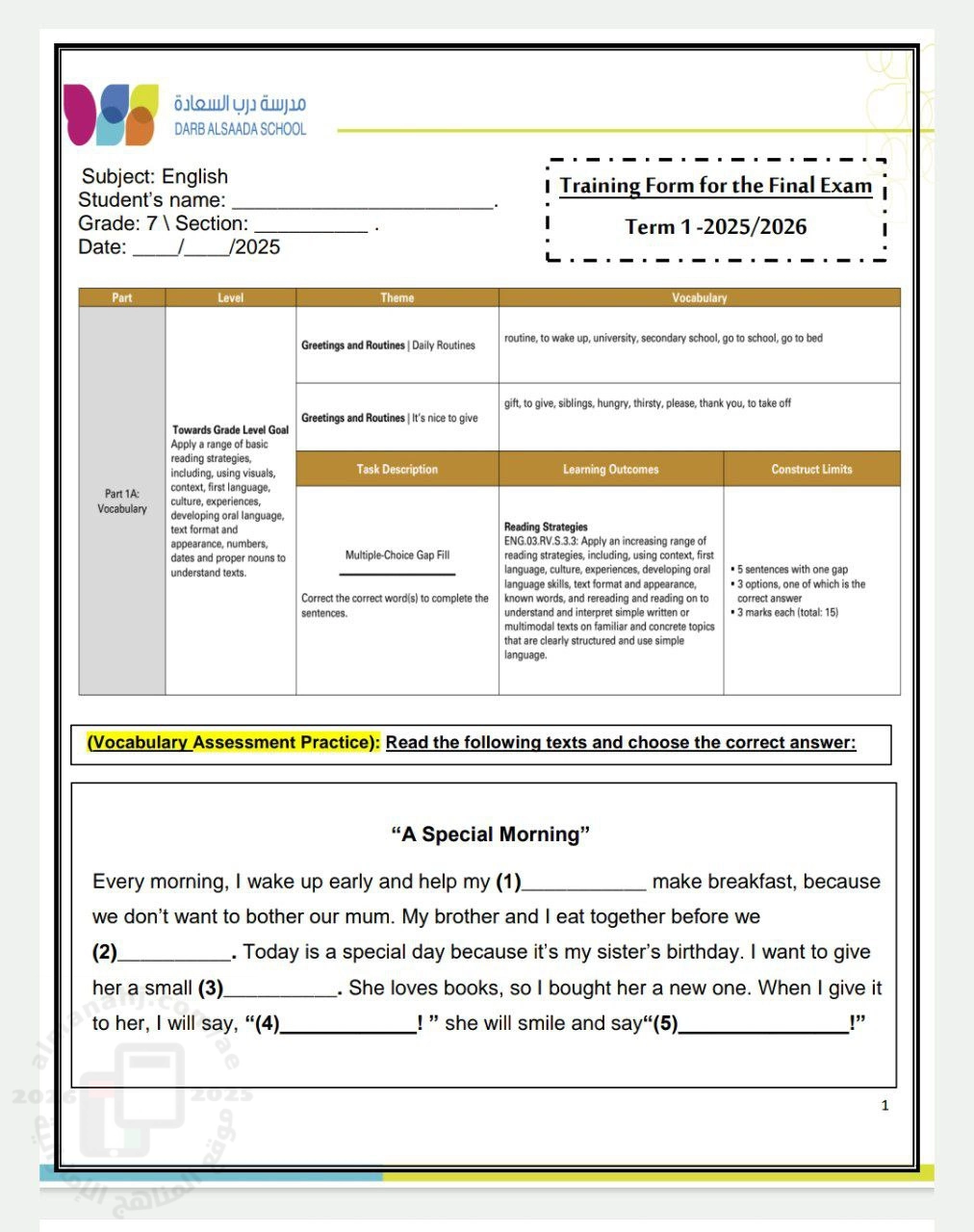 | 1. كل ما يخص امتحان الاعادة (تمكين) للصف السابع