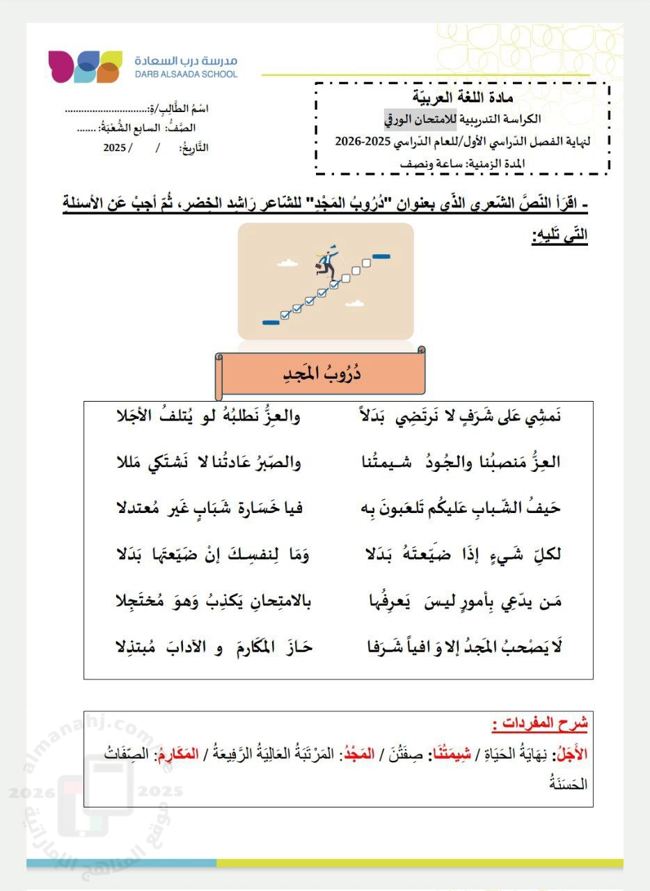 | 1. كل ما يخص امتحان الاعادة (تمكين) للصف السابع