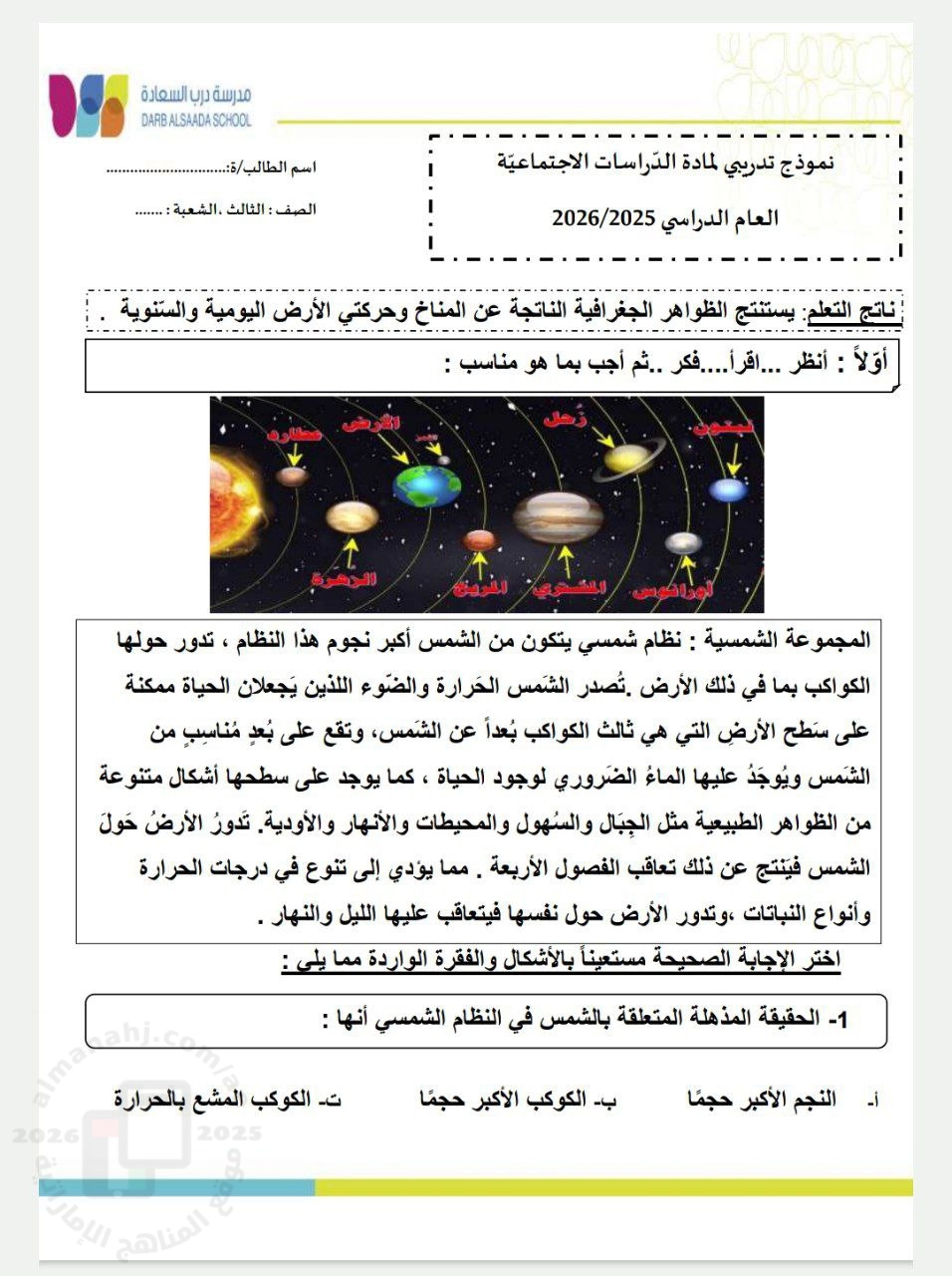 معلومات الملف: كراسة تدريبية مراجعة وفق الهيكل الوزاري الجديد بدون الحل من مدرسة درب السعادة