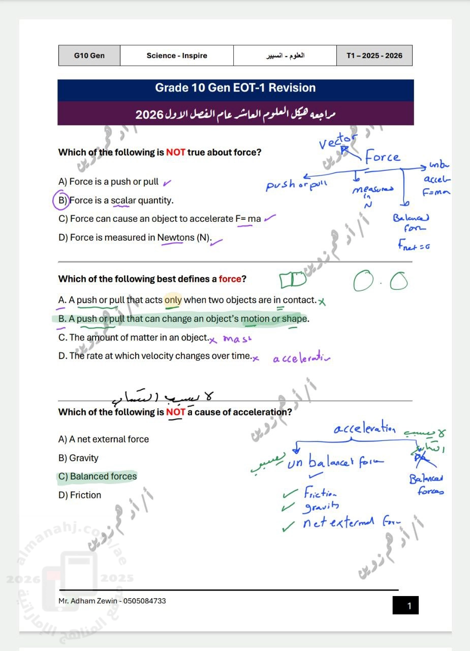 8. الصف العاشر العام, فيزياء, مراجعة نهائية وفق الهيكل الوزاري الجديد منهج انسباير
