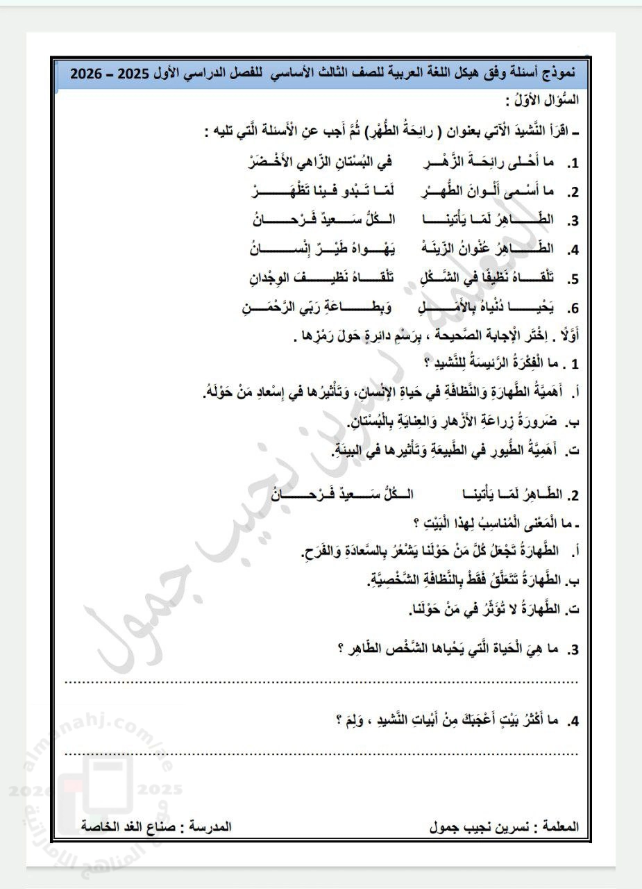 | نموذج الأسئلة الأول وفق الهيكل الوزاري الجديد - إعداد: نسرين نجيب جمول | ||