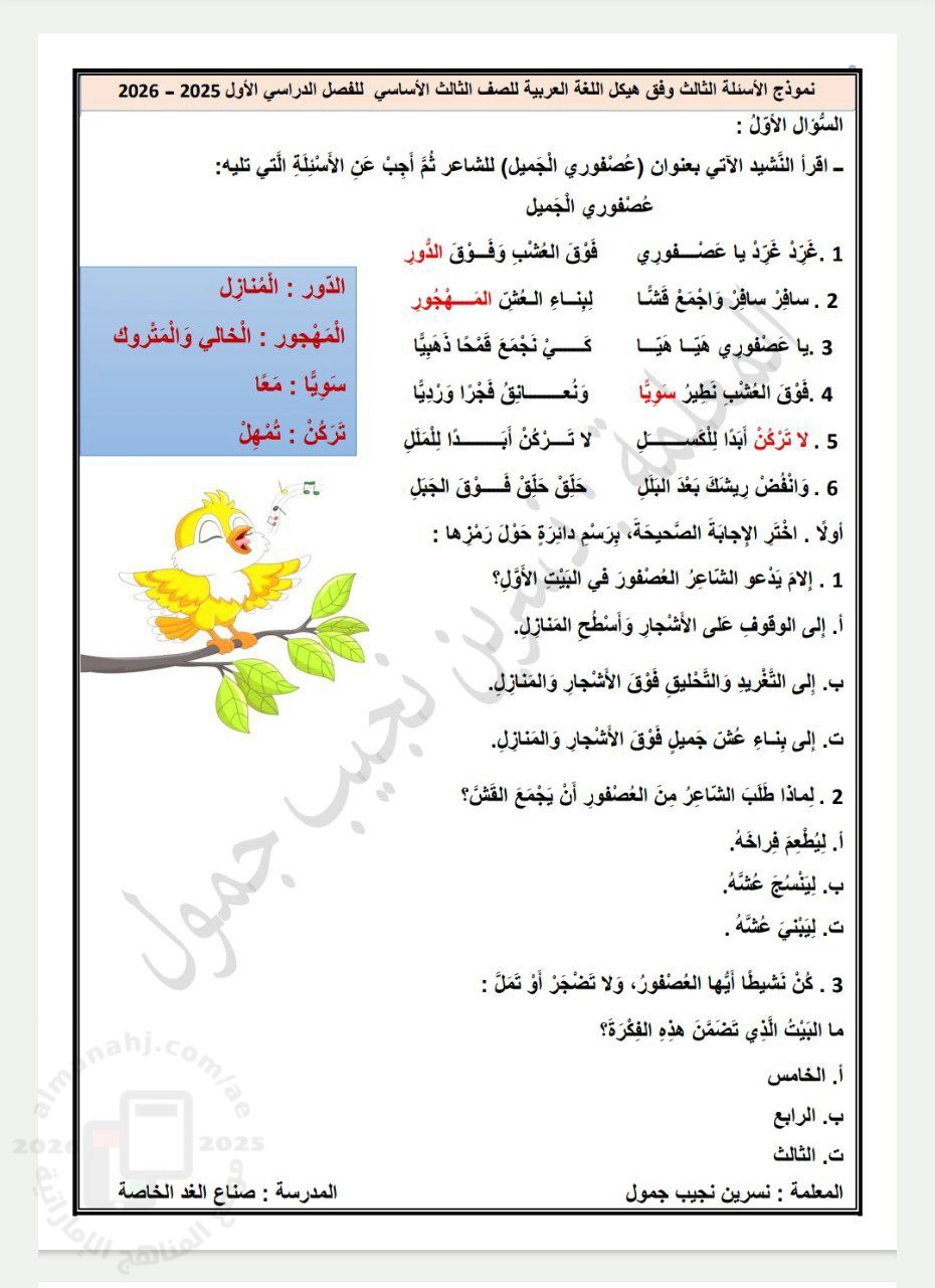 | نموذج الأسئلة الثالث وفق الهيكل الوزاري الجديد - إعداد: نسرين نجيب جمول | ||