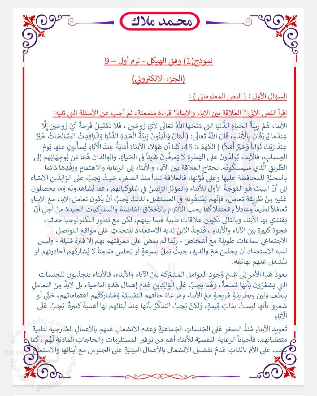 معلومات الملف: نموذج تدريبي أول وفق الهيكل الوزاري الجديد بقسميه الالكتروني و الورقي بدون الحل