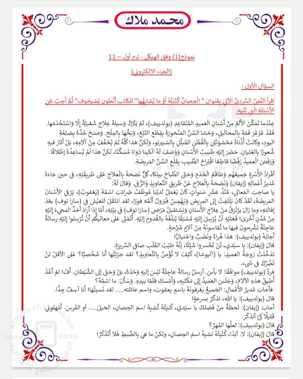 معلومات الملف: نموذج تدريبي أول وفق الهيكل الوزاري الجديد بقسميه الالكتروني و الورقي بدون الحل