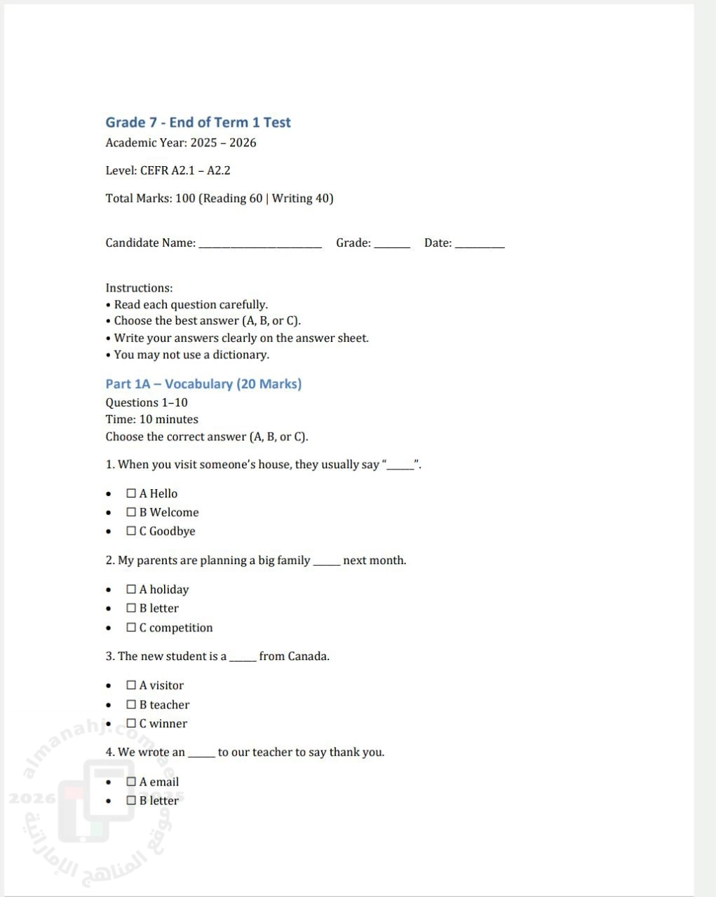 | أنت هنا: موقع المناهج ⇦ المناهج الإماراتية ⇦ الصف السابع ⇦ لغة انجليزية ⇦ الفصل الأول ⇦ اختبارات |