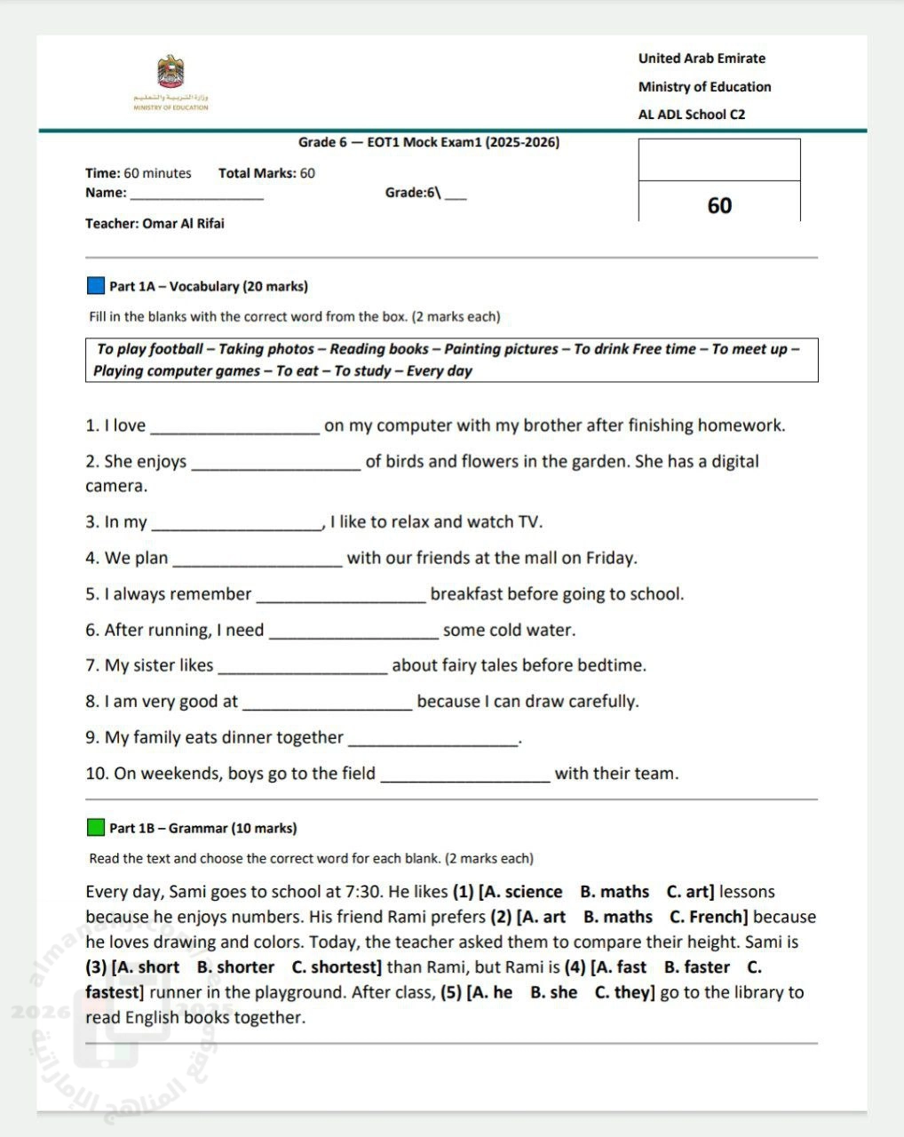 | نموذج تدريبي Mock axam 1 للاختبار النهائي - إعداد: Omar Al Rifai | ||