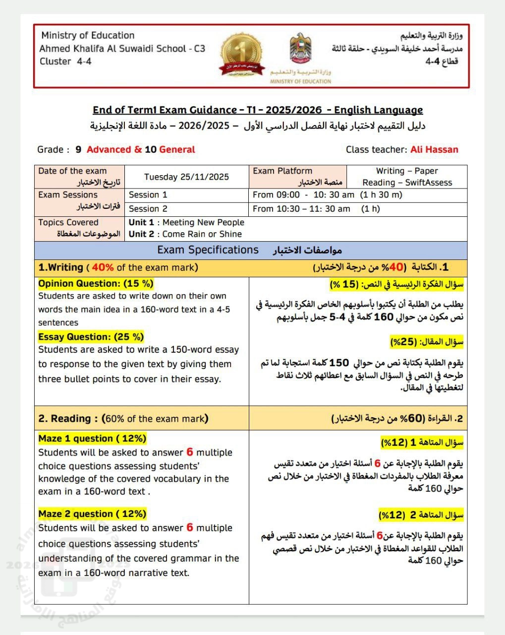 معلومات الملف: دليل التقييم لاختبار نهاية الفصل الأول المسار المتقدم