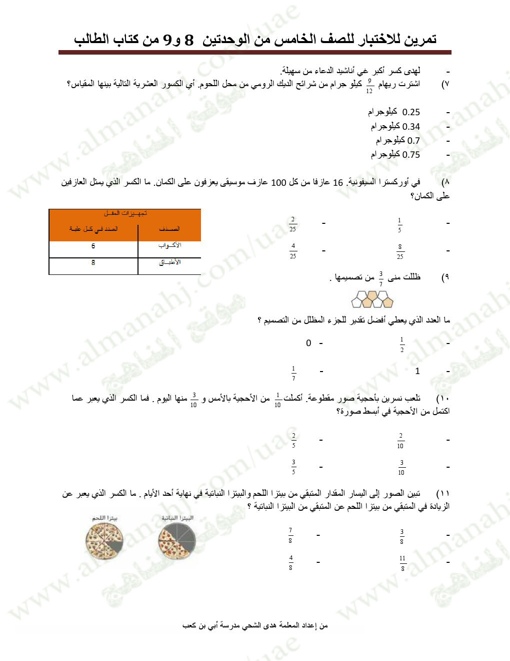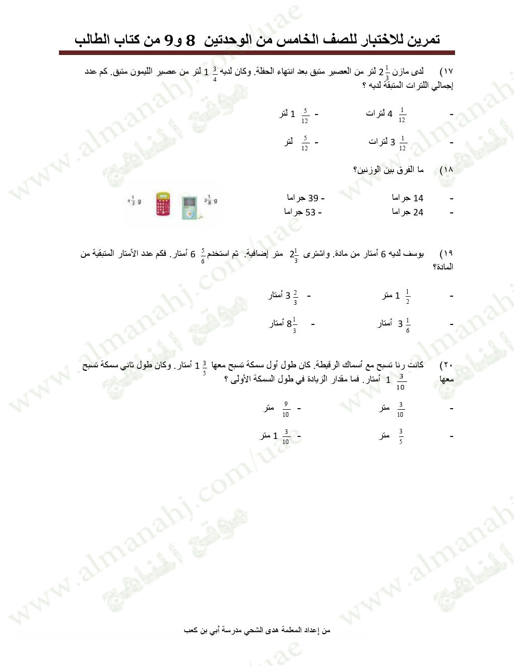 معلومات الملف: الصف الخامس, الفصل الثاني, رياضيات, تمرينات للاختبار في الوحدتين 8و9 | |||