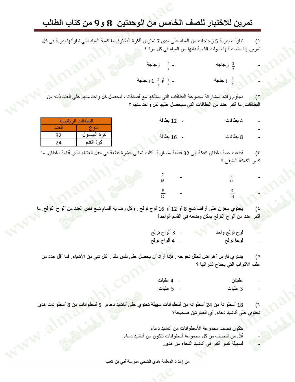 | معلومات الملف: الصف الخامس, الفصل الثاني, رياضيات, تمرينات للاختبار في الوحدتين 8و9 | |||