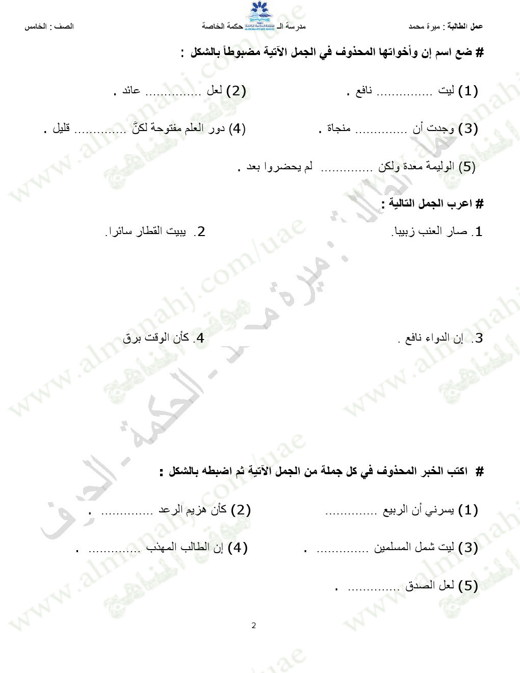 معلومات الملف: الصف الخامس, الفصل الثاني, لغة عربية, 2017-2018, تدريبات كان واخواتها | |||