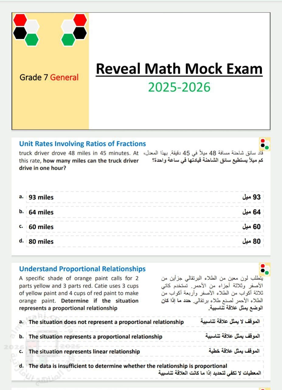 2. الصف السابع, رياضيات, نموذج اختبار تجرببي Mock Exam منهج ريفيل القسم الالكتروني