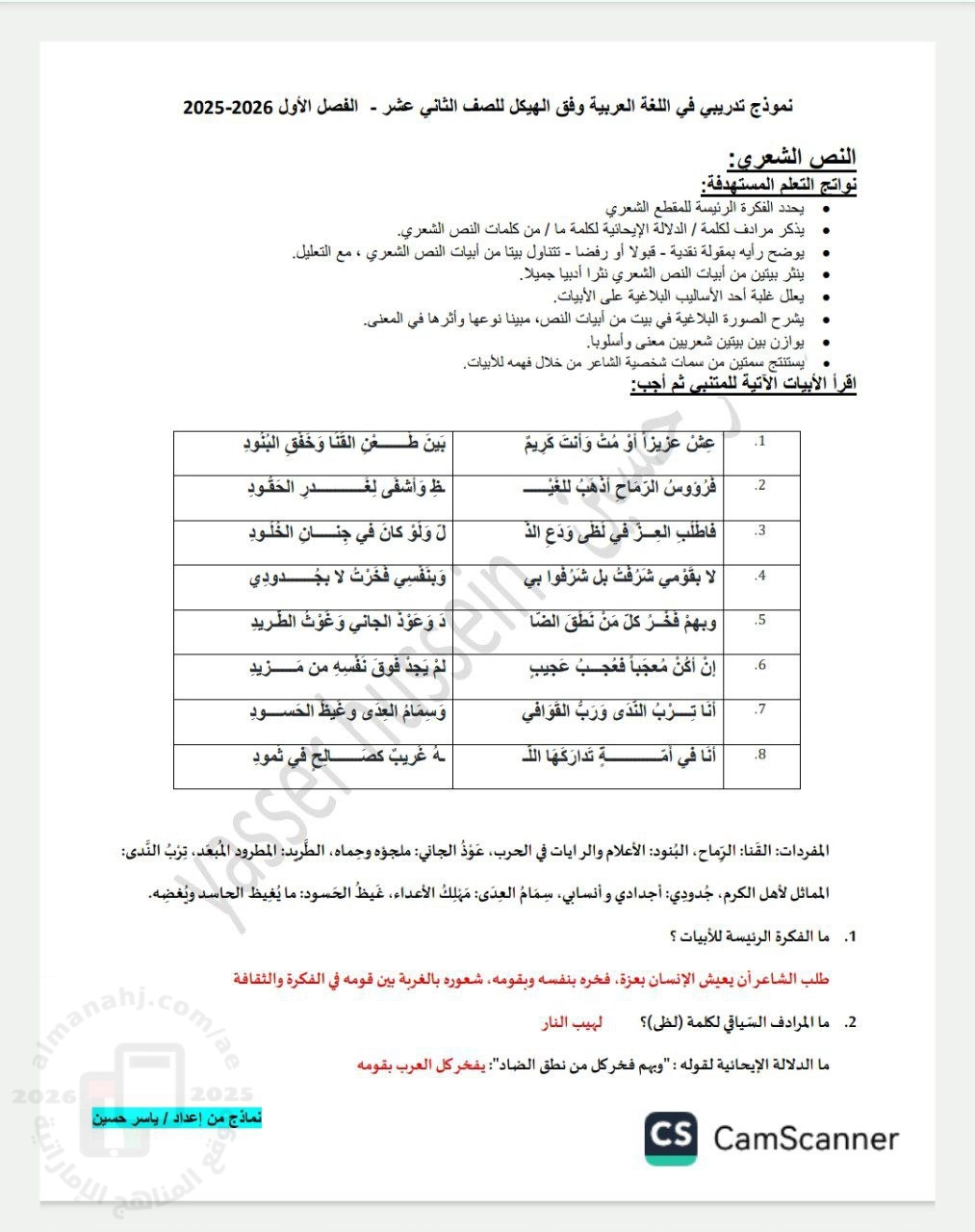 | حل اختبار تدريبي في النص الشعري وفق الهيكل الوزاري الجديد - إعداد: ياسر اسماعيل حسين | ||