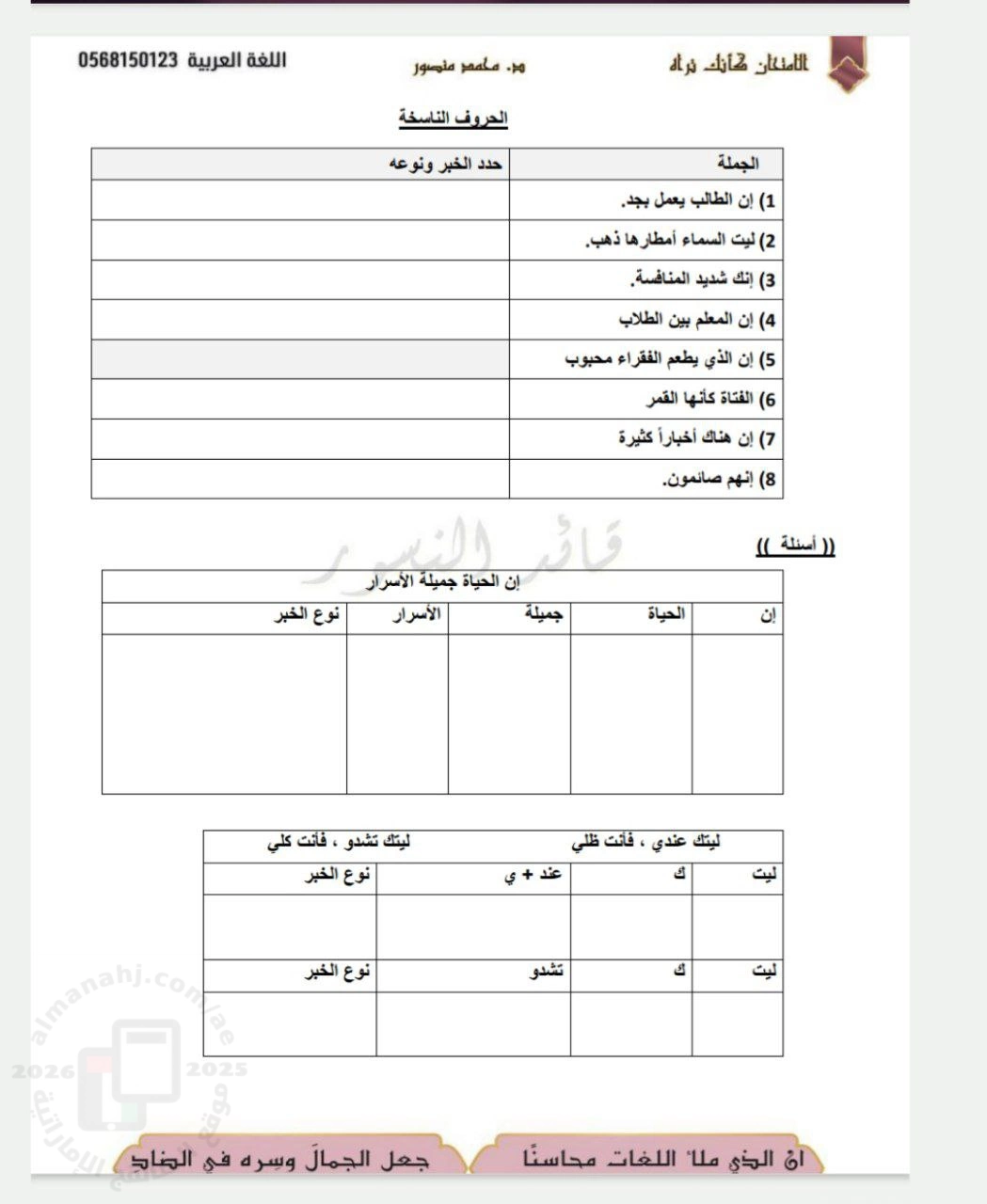 | مراجعة الحروف الناسخة ولا النافية للجنس وظن وأخواتها مع تدريبات - إعداد: محمد منصور | ||