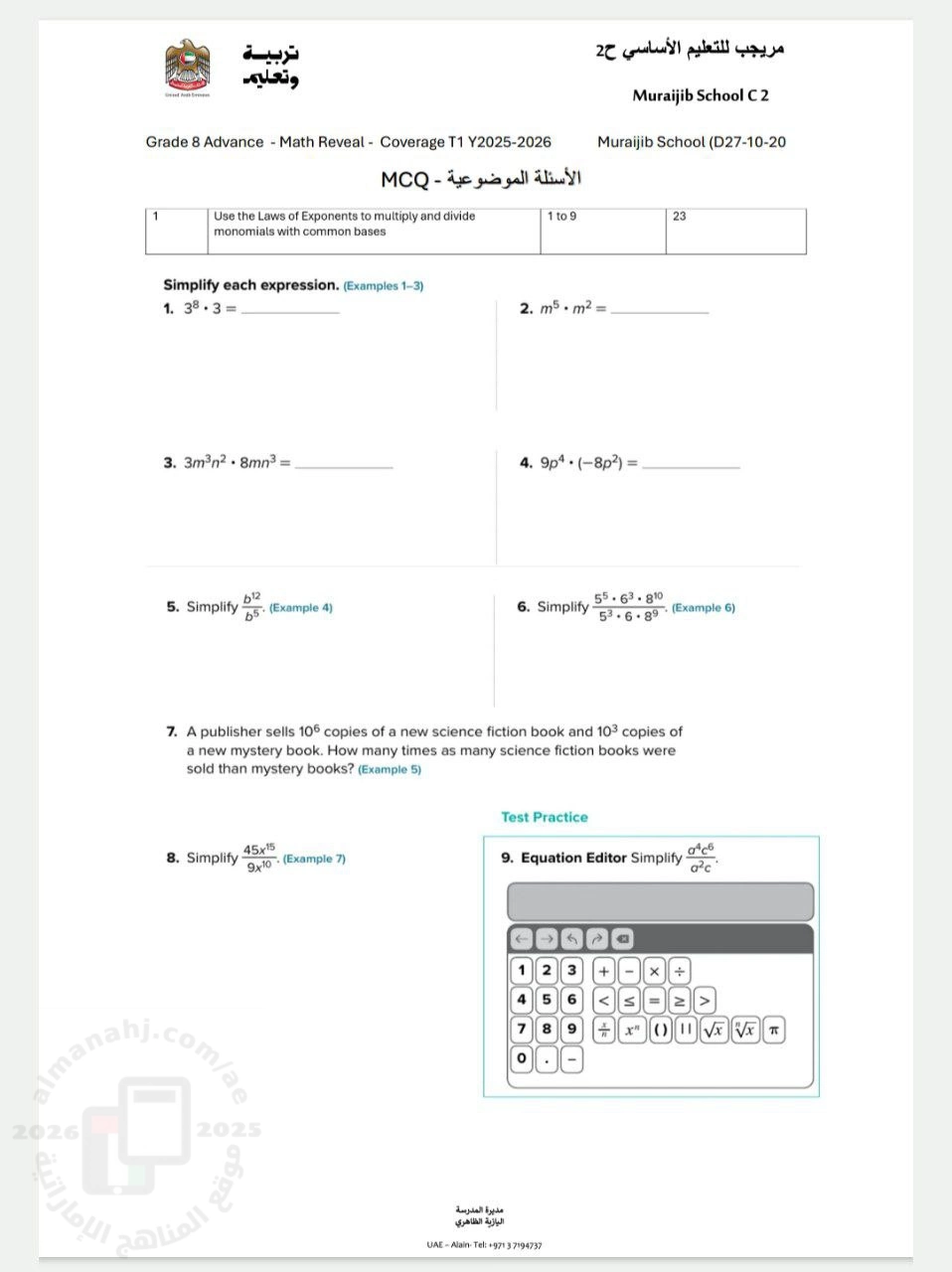 1. الصف الثامن, رياضيات, مراجعة وفق الهيكل الوزاري الجديد منهج ريفيل المسار المتقدم