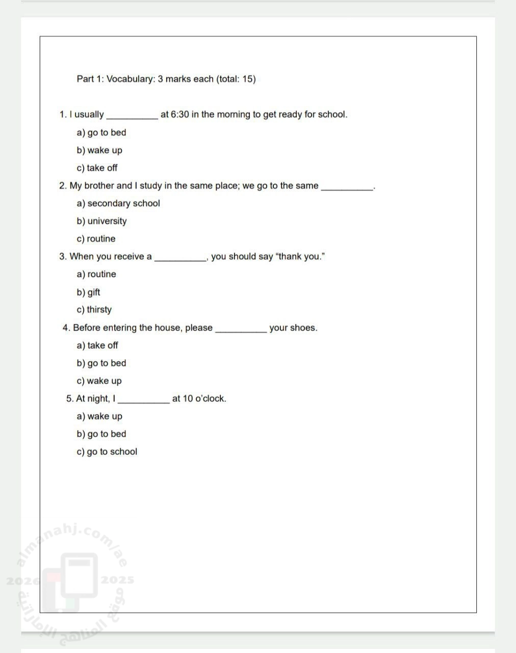 | أنت هنا: موقع المناهج ⇦ المناهج الإماراتية ⇦ الصف السابع ⇦ لغة انجليزية ⇦ الفصل الأول ⇦ اختبارات |