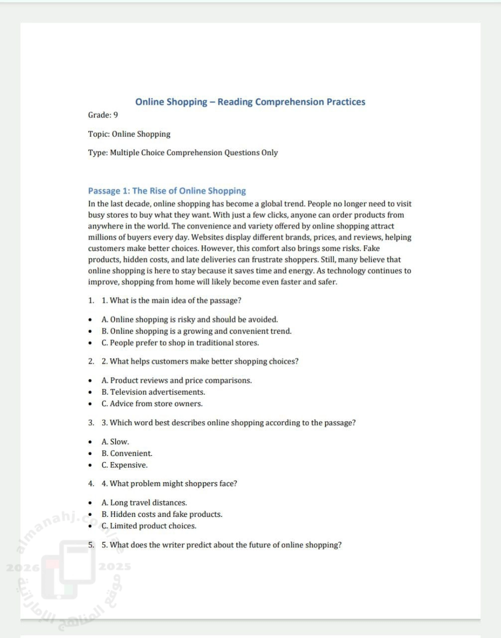 تم إيجاد الملف: تدريبات قراءة Online Shopping متبوعة بالإجابات