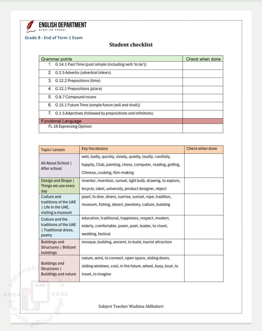 | أهلاً بكم جميعاً طلاباً ومدرسين وأهالي طلبة ومهتمين، في قسم دولة الإمارات ، نحن الآن في الفصل الأول من العام الدراسي 2025/2026 وتاريخ اليوم 2025/12/06 م | |