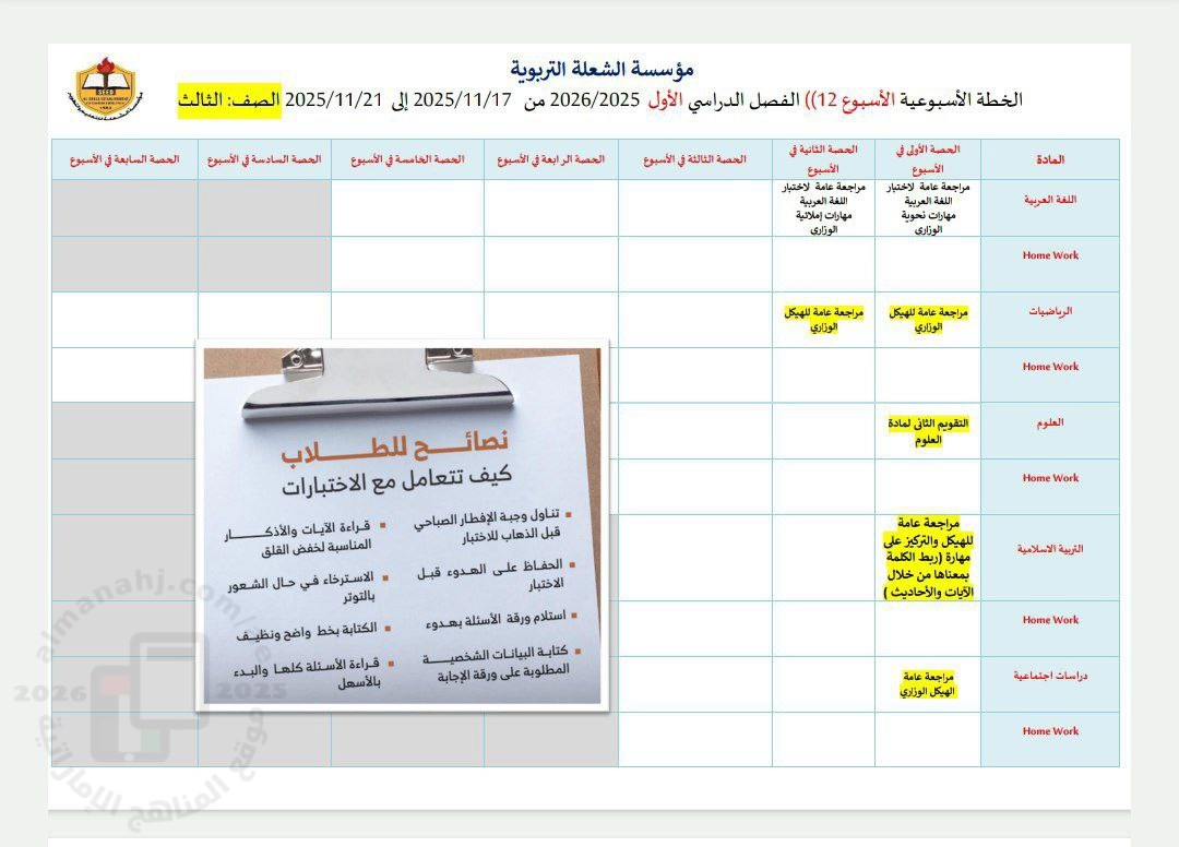 تم إيجاد الملف: الخطة الأسبوعية الأسبوع الثاني عشر للصفوف (3-11) من مؤسسة الشعلة التربوية