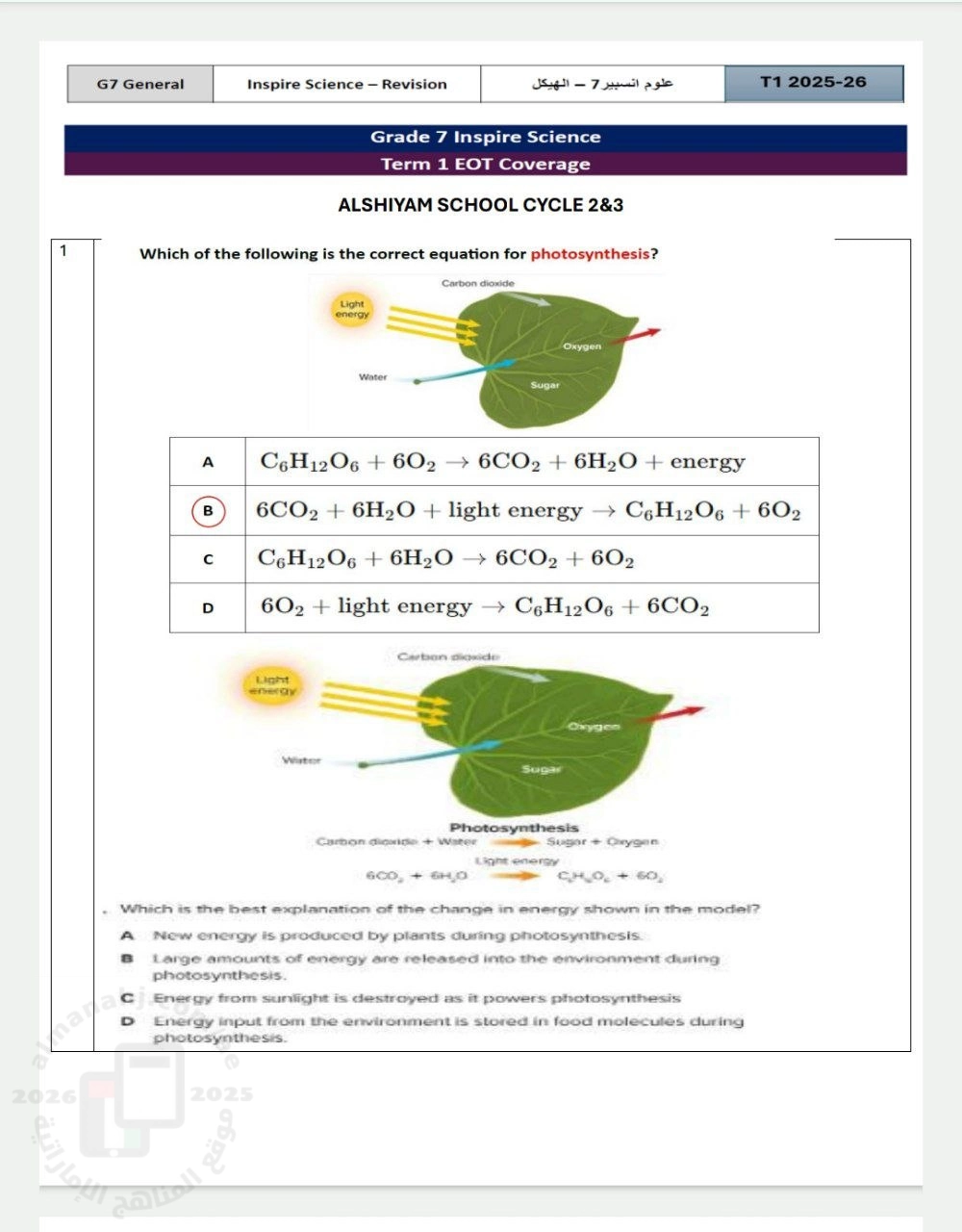 11. الصف السابع, علوم, أسئلة الامتحان النهائي القسم الورقي منهج بريدج بدون الحل