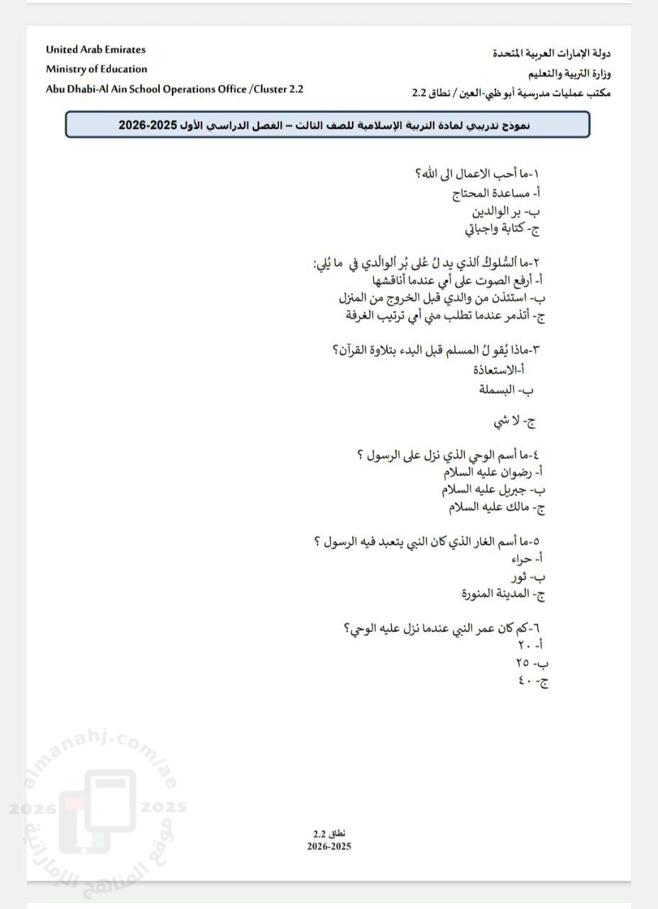 | نموذج تدريبي أول وفق الهيكل الوزاري متبوع بالإجابات - إعداد: مكتب عمليات مدرسية أبو ظبي | ||