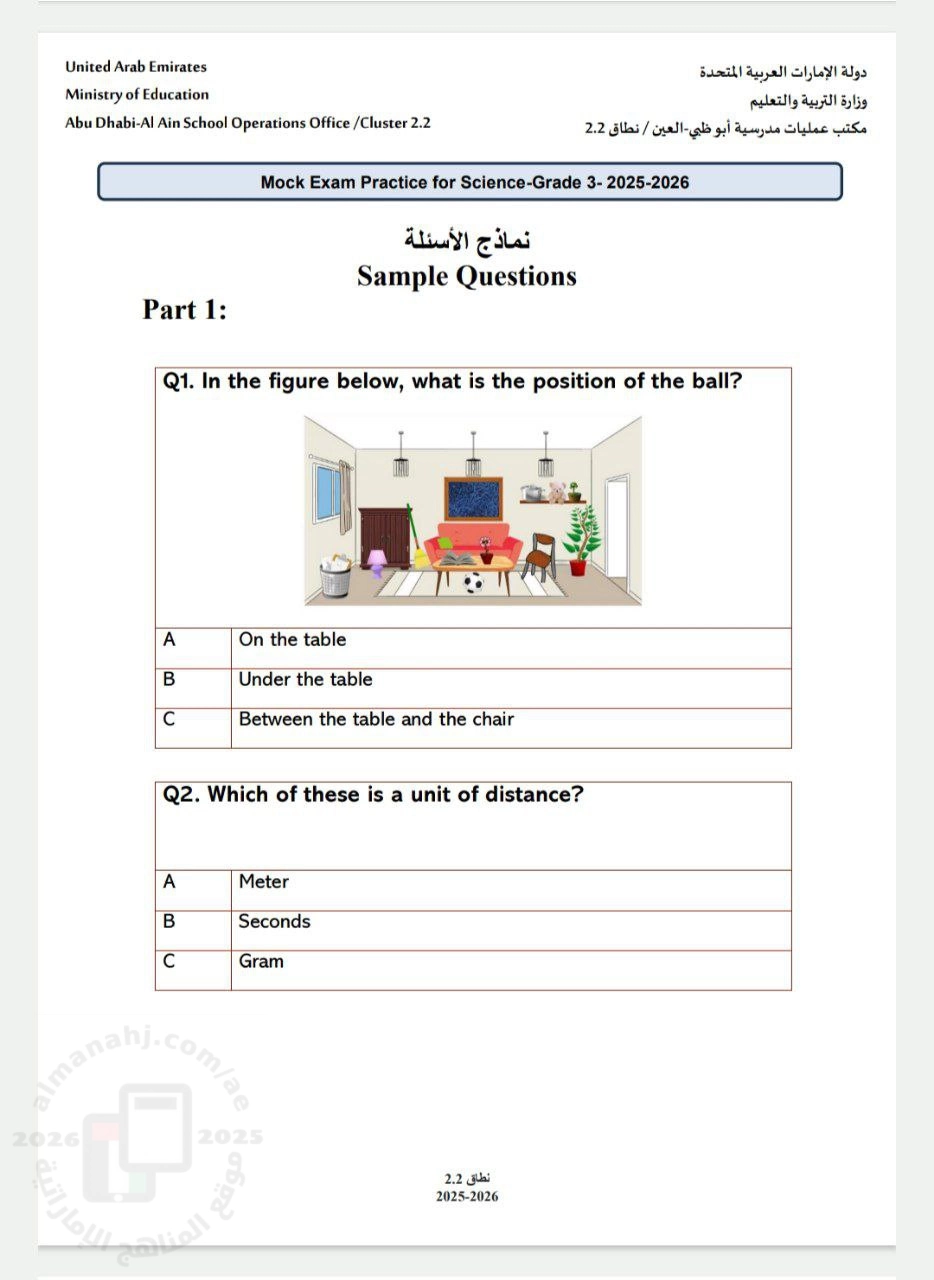 15. الصف الثالث, علوم, نموذج تدريبي ثان وفق الهيكل الوزاري منهج انسباير متبوع بالإجابات