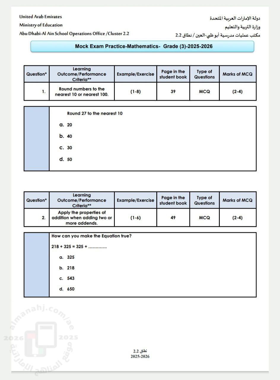 9. الصف الرابع, رياضيات, نموذج تدريبي ثان وفق الهيكل الوزاري منهج ريفيل متبوع بالإجابات