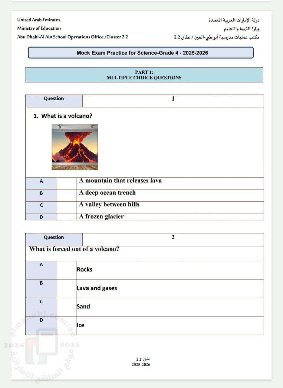 6. الصف الرابع, اجتماعيات, نموذج تدريبي ثان وفق الهيكل الوزاري متبوع بالإجابات