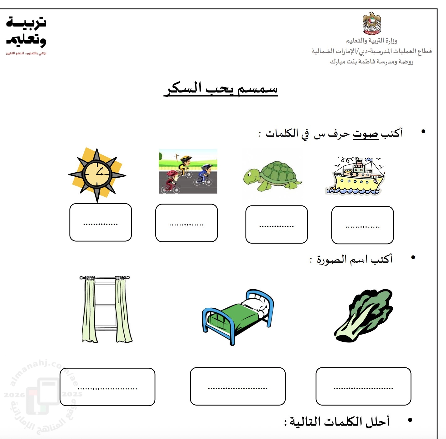 معلومات الملف: يتضمّن الملف المرفق مجموعة أوراق عمل تعليمية مخصّصة لطلبة الصف الأول حول قصة «سمسم يحبّ السكر» ويهدف إلى تدريب الطالب على قراءة حرف السين، وتحليل الكلمات، وكتابة أسماء الصور، وتركيب كلمات من حروف معطاة، إضافةً إلى مجموعة من الأسئلة القرائية التي تساعد على تنمية مهارات الفهم والاستيعاب. يشمل المحتوى تدريبات متنوّعة مثل: