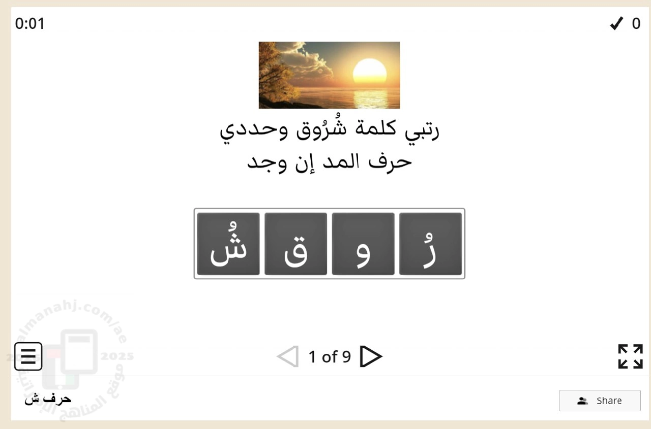 - مراجعة قبلية عبر جُمل قصيرة يختار فيها المتعلم الصورة المناسبة. يُعد هذا الملف مادة مناسبة لتهيئة الطلاب قبل الدرس أو دعمه أثناء شرح مهارات القراءة، ويمكن استخدامه داخل الصف أو عبر التعلّم الإلكتروني. | ||